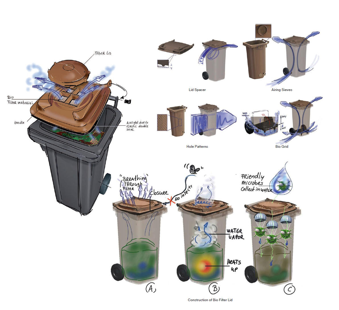 Normal 2-Wheeled container can be upgraded to become bio-waste containers by adding air circulation or even seal-proof filter lid.